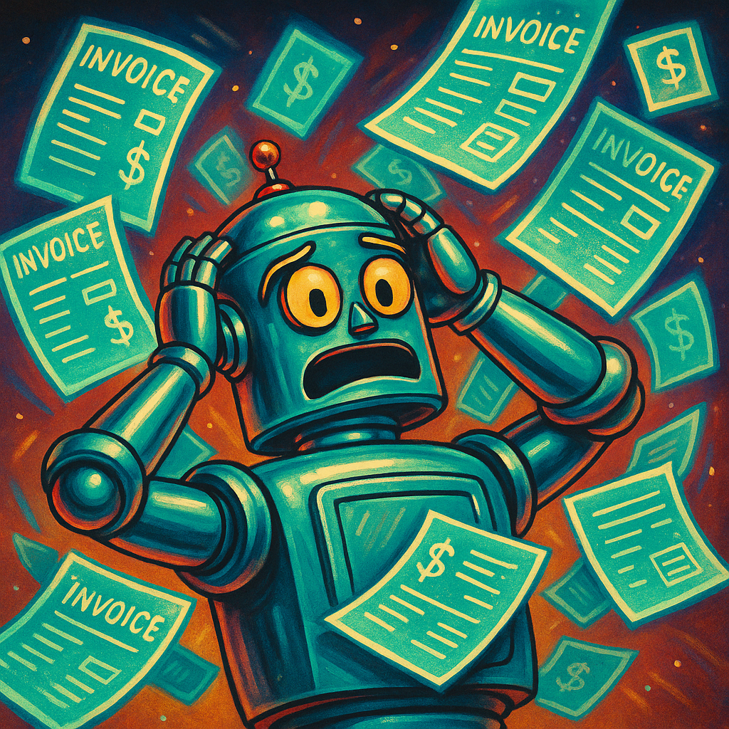 Prompt: Make a retro-futuristic illustration of a 1950s-style robot overwhelmed by flying holographic invoices. Vibrant retro colors, chrome reflections, no text. 1:1 aspect ratio.