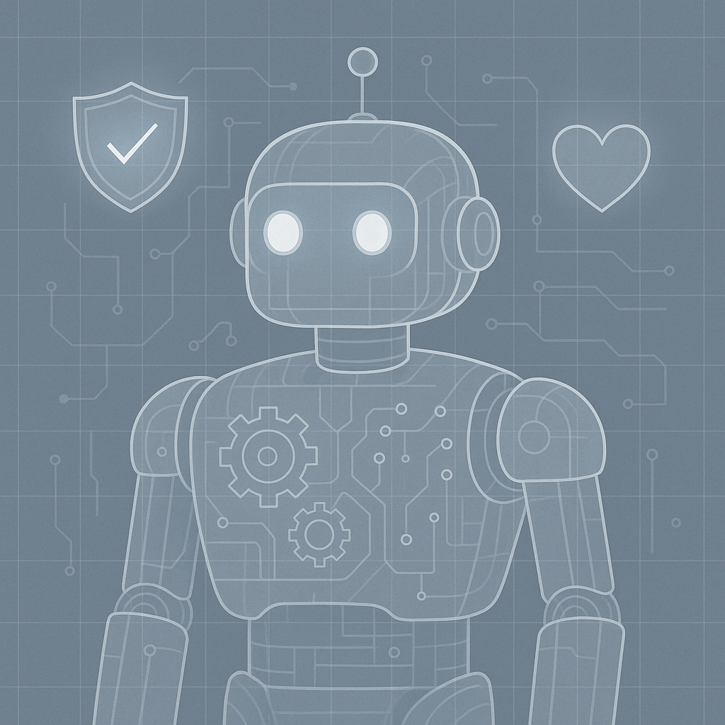 Prompt: A semi-transparent robot shown as blueprint line-art, gears and circuits visible, symbolizing transparent AI decision-making, calm monochrome palette, clean schematic lines, trust icons glowing subtly.