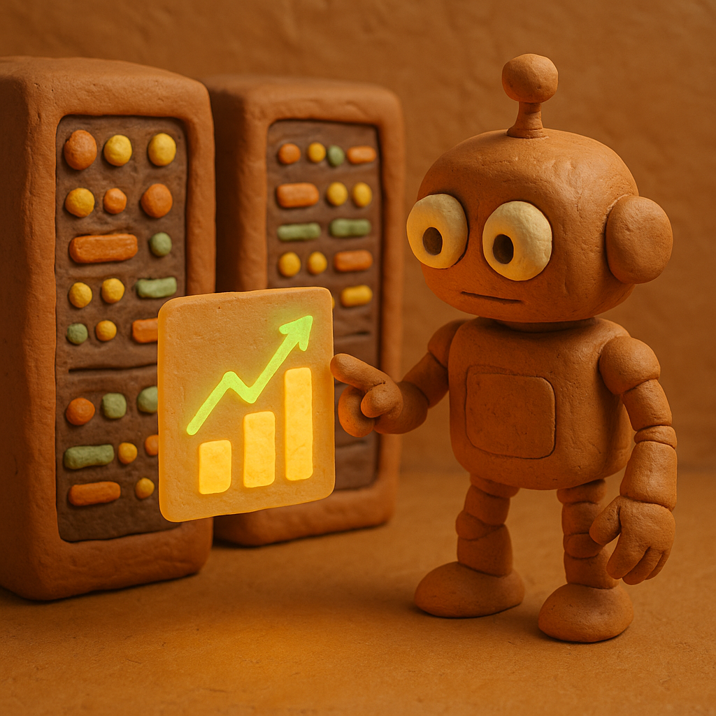 Prompt: Claymation-style 3D data center, soft textured clay servers, charming robot made of molded clay inspecting glowing investment graphs, whimsical lighting, handcrafted look.