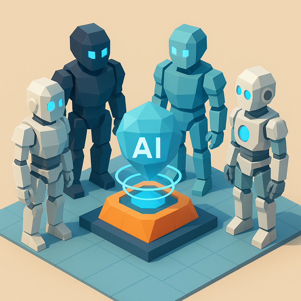 Prompt: A low-poly 3D artwork of AI leaders visualized as polygonal robots standing around a simplified AI core. Flat colors, clean edges, minimalist charm.